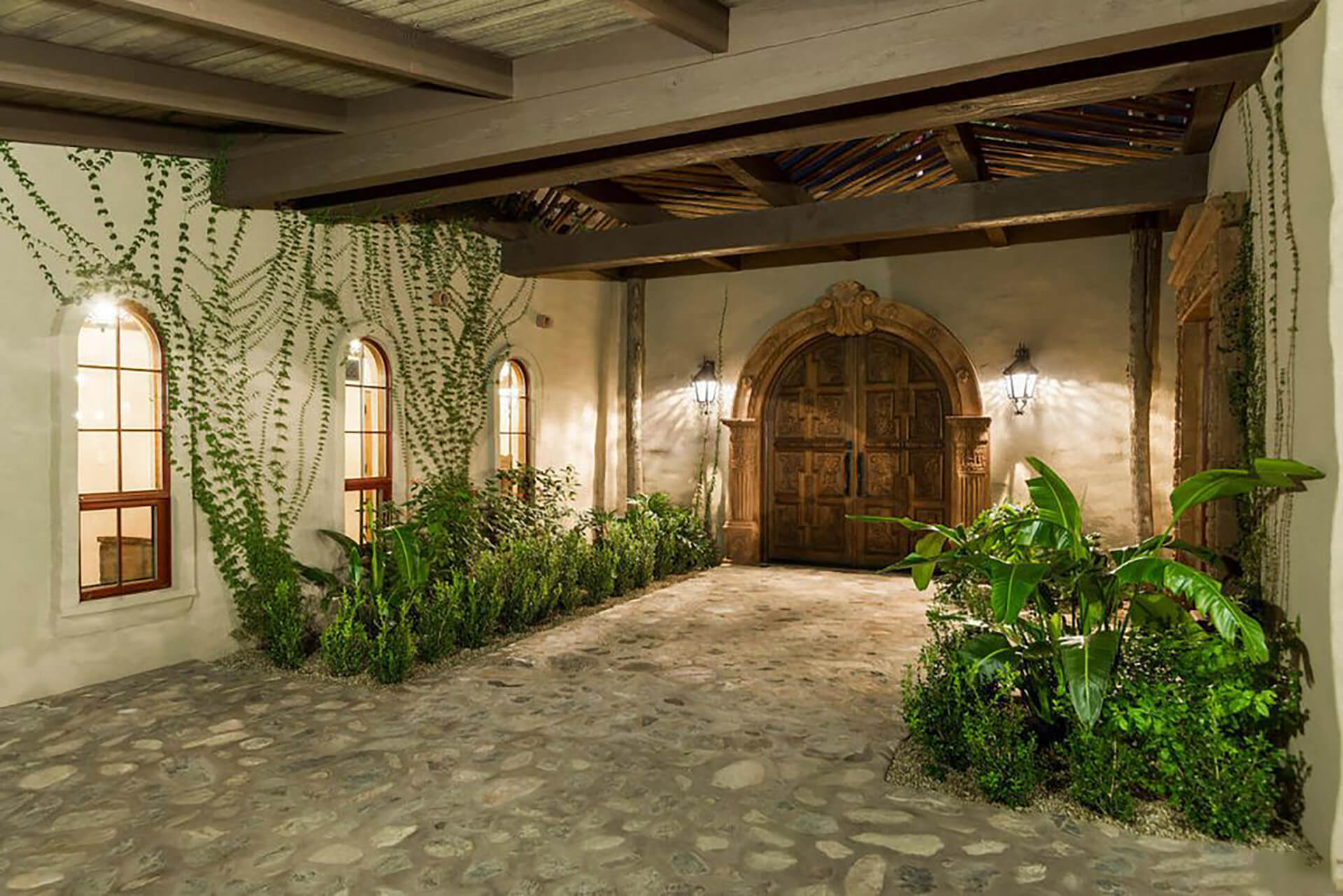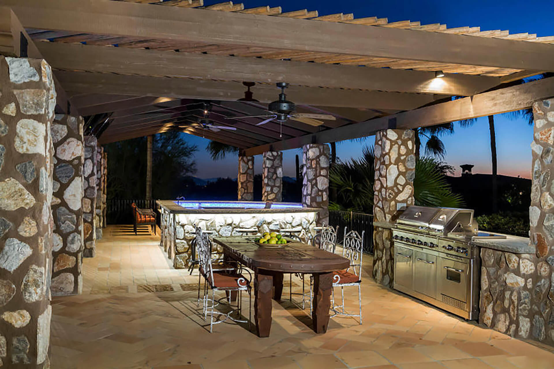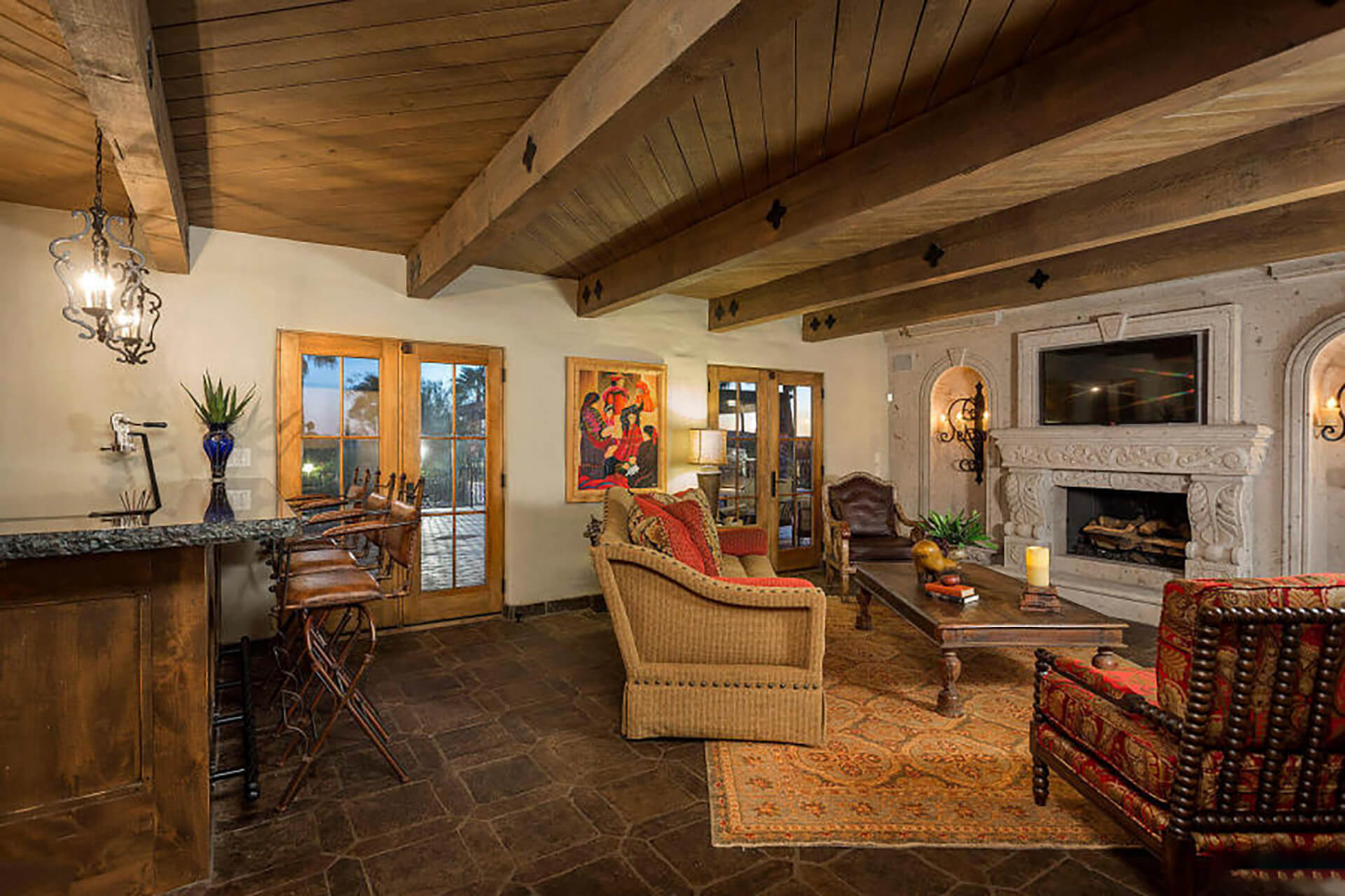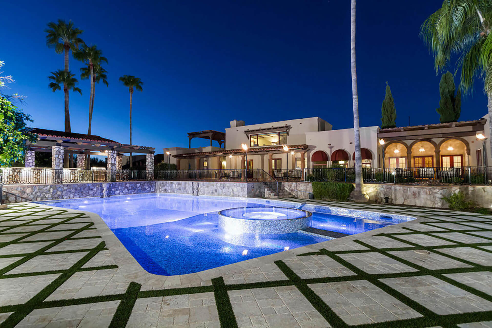 This magnificent home on over 3 acres is an authentic piece of historical architecture with stunning views. Completely restored / remodeled with many new additions over 2.5 years to combine old world charm with state of the art amenities. 5 bedrooms, 8 baths + a den above the beautiful master suite. Fountains, hand carved mahogany doors, beamed ceilings, 120 ft grand hallway w/lighted brick arched ceiling, gorgeous new kitchen, butlers pantry, new stained saltillo flooring & soap stone/leather granite counters. Lighted Bocce court, 6 hole putting green, resort backyard, city lights, 30x60 pool/spa, 4 wet bars + an old world Mexican bar, Ramada w/ outdoor kitchen, BBQ, wine cellar & citrus tree