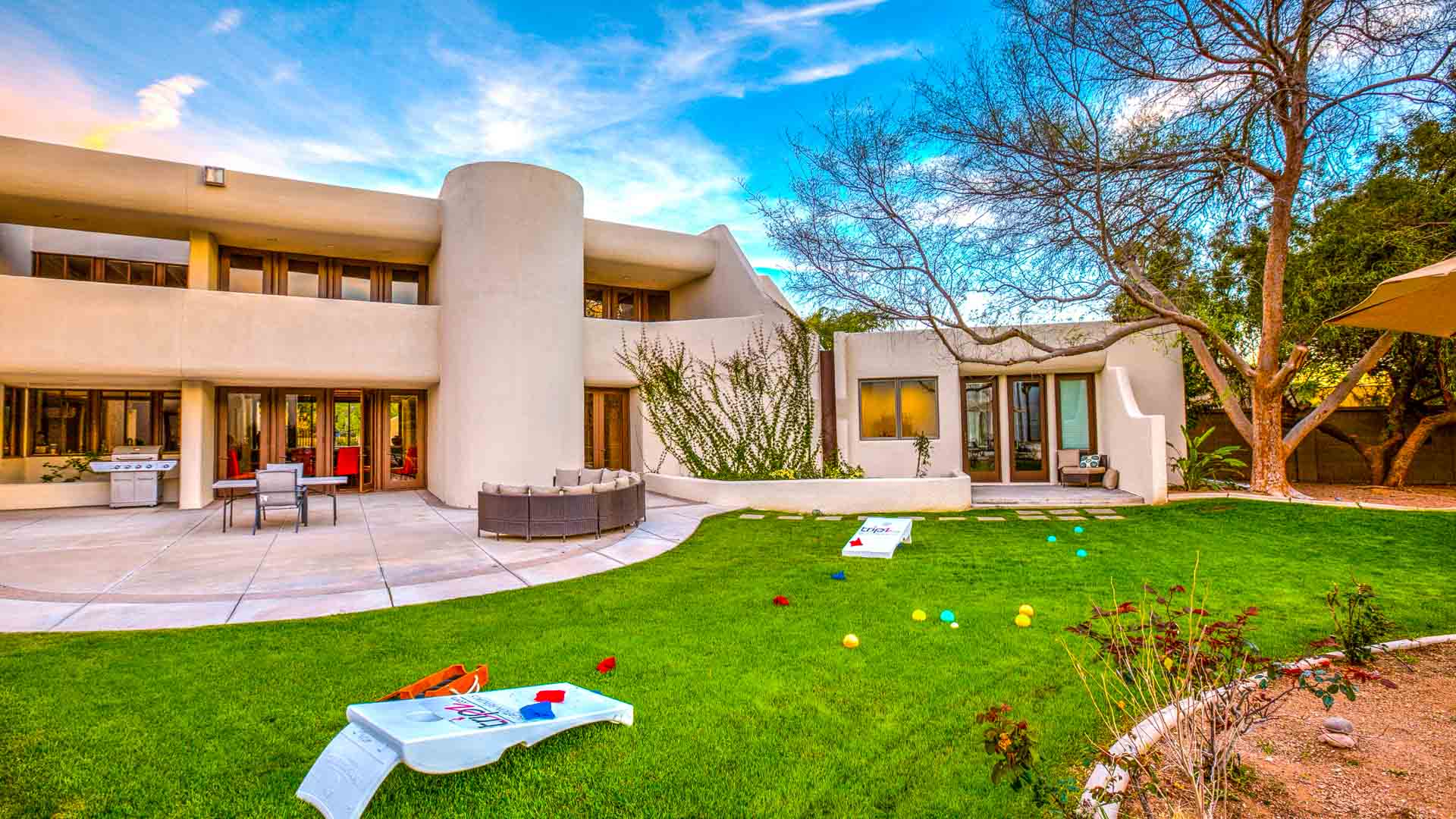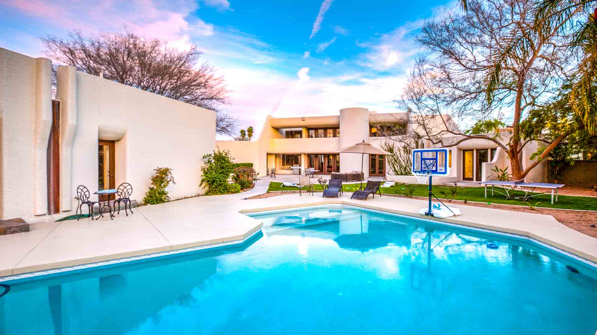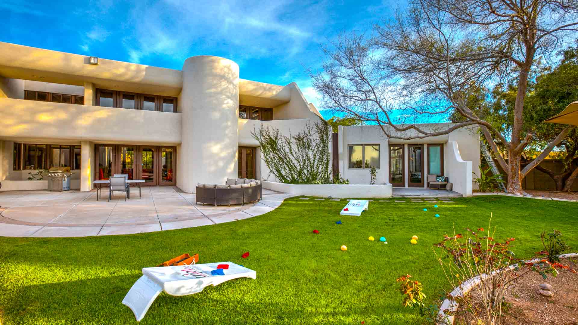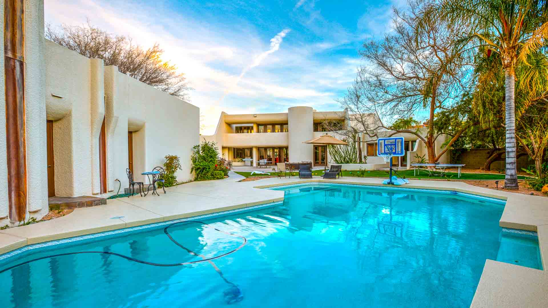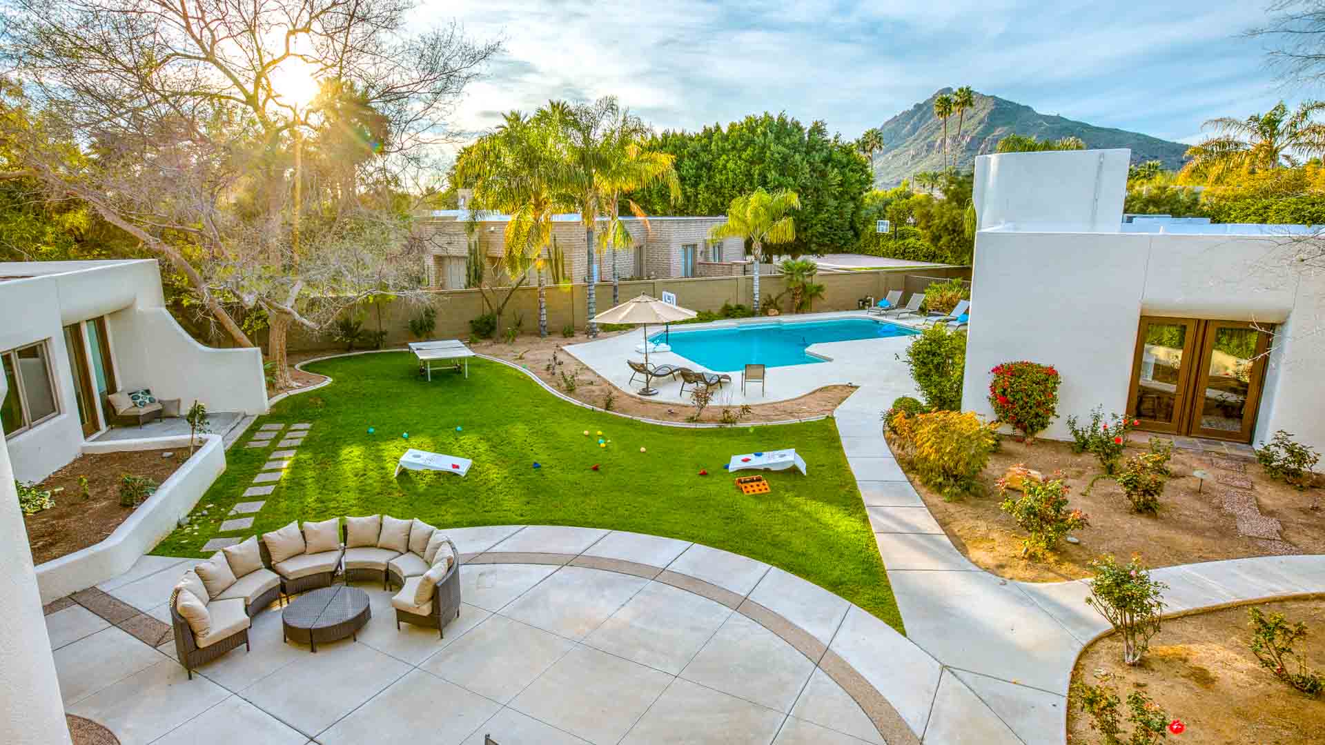 An amazing gated 1.5 acre estate in the heart of Arcadia, inspired by Frank Lloyd Wright. Walking Distance to Old Town! This home boasts over 13,000 sq ft, 8 bedrooms, 10 baths, and a guest house - all with Camelback Mountain views. There is a 9th sleeping area for extra sleeping arrangements. The kitchen is the center point of the home, with the secondary bedrooms split from the master retreat. A fun surprise is the indoor racquetball court, air hockey table & basketball hoop! Solid Brazilian Cherry wood floors. Perfect for your family rental...Large pool, a ''football field'' of grass and a path that goes around the entire property, all this while enjoying your estate surrounded by complete privacy. Welcome to your amazing vacation get-away!