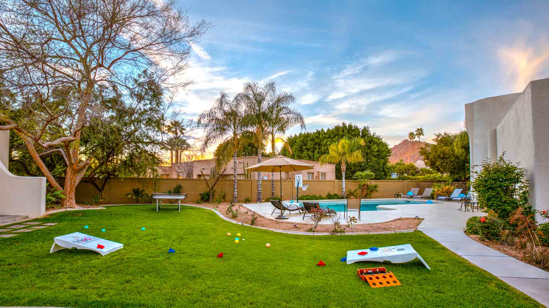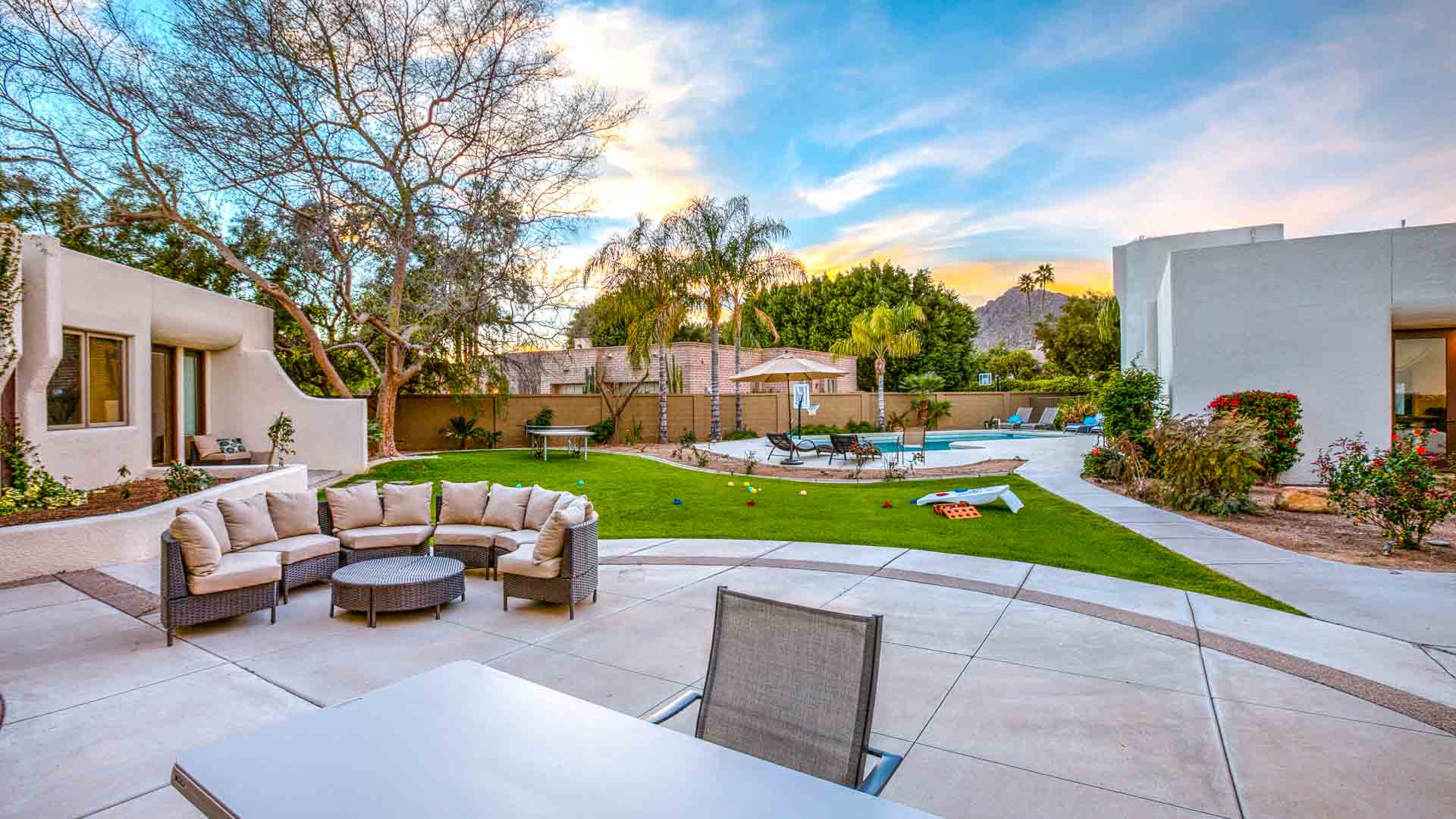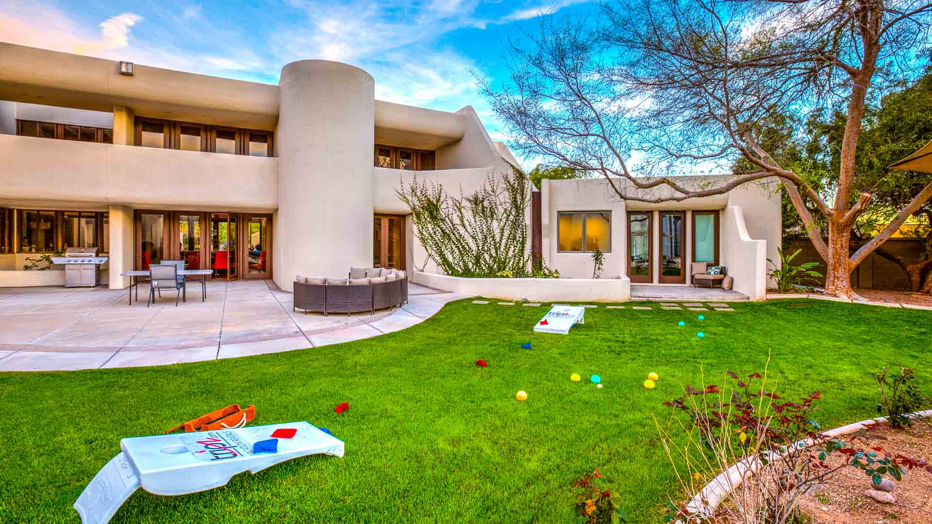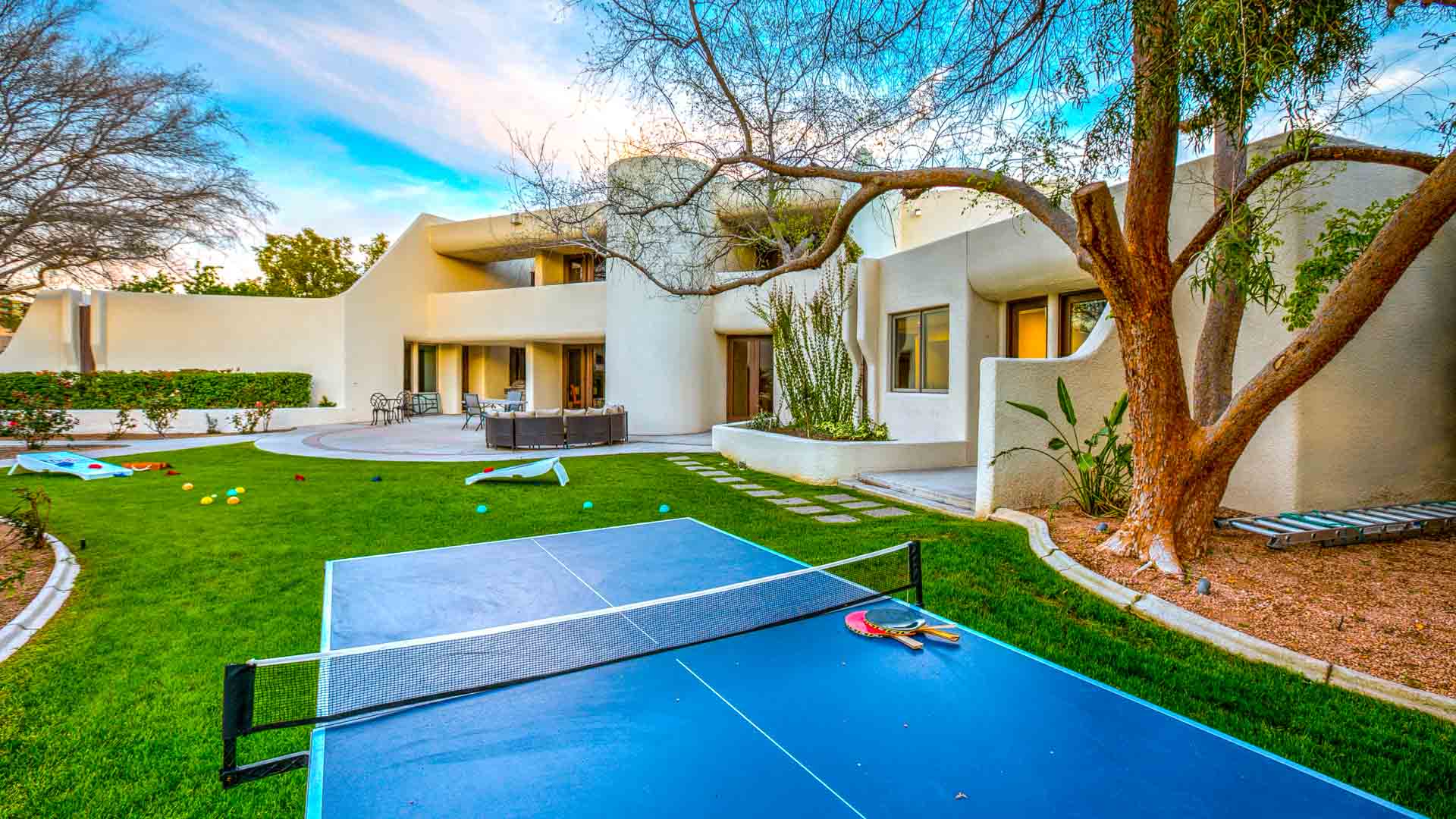 An amazing gated 1.5 acre estate in the heart of Arcadia, inspired by Frank Lloyd Wright. Walking Distance to Old Town! This home boasts over 13,000 sq ft, 8 bedrooms, 10 baths, and a guest house - all with Camelback Mountain views. There is a 9th sleeping area for extra sleeping arrangements. The kitchen is the center point of the home, with the secondary bedrooms split from the master retreat. A fun surprise is the indoor racquetball court, air hockey table & basketball hoop! Solid Brazilian Cherry wood floors. Perfect for your family rental...Large pool, a ''football field'' of grass and a path that goes around the entire property, all this while enjoying your estate surrounded by complete privacy. Welcome to your amazing vacation get-away!