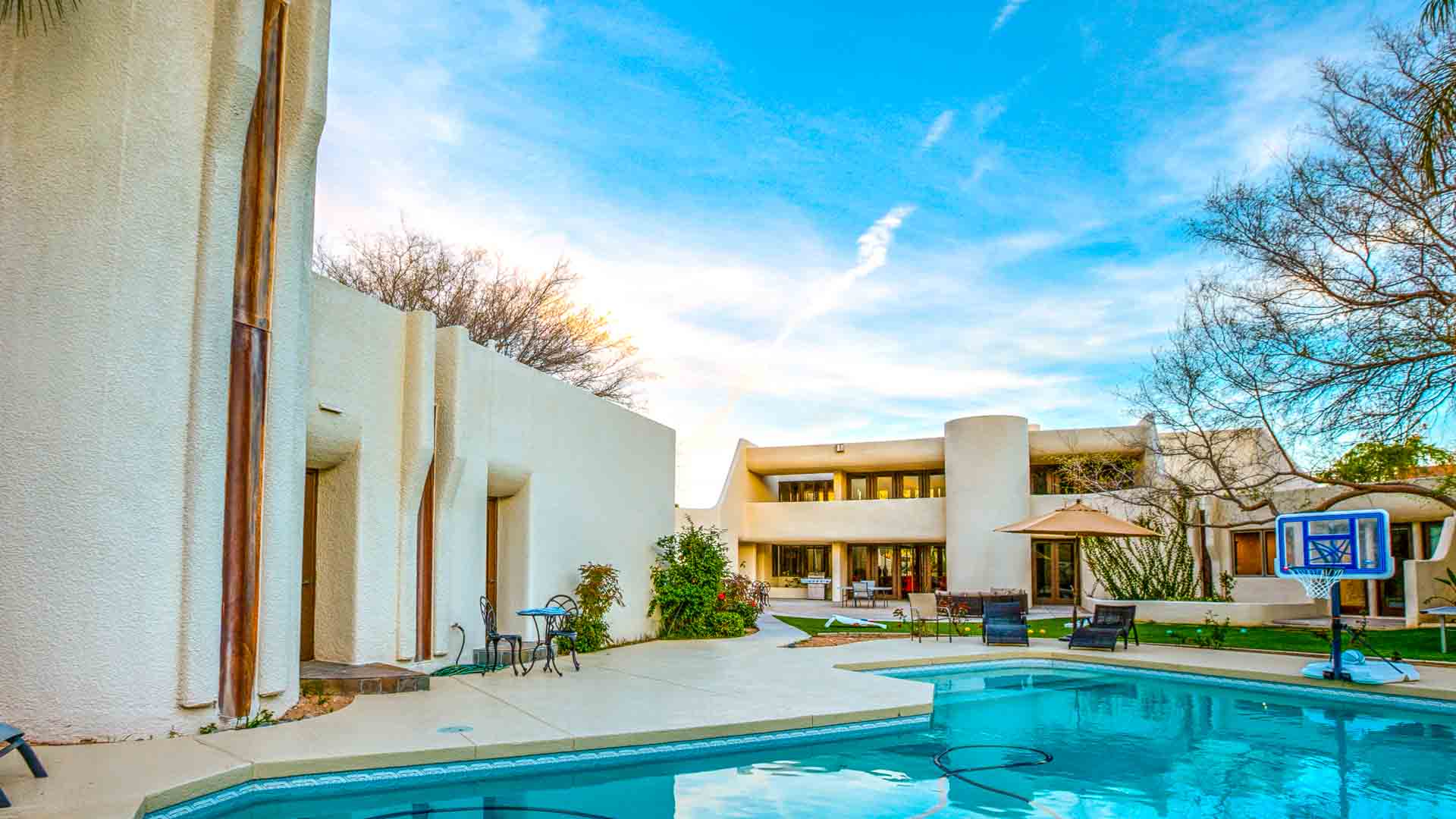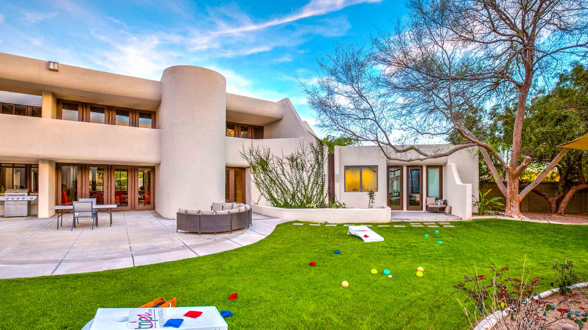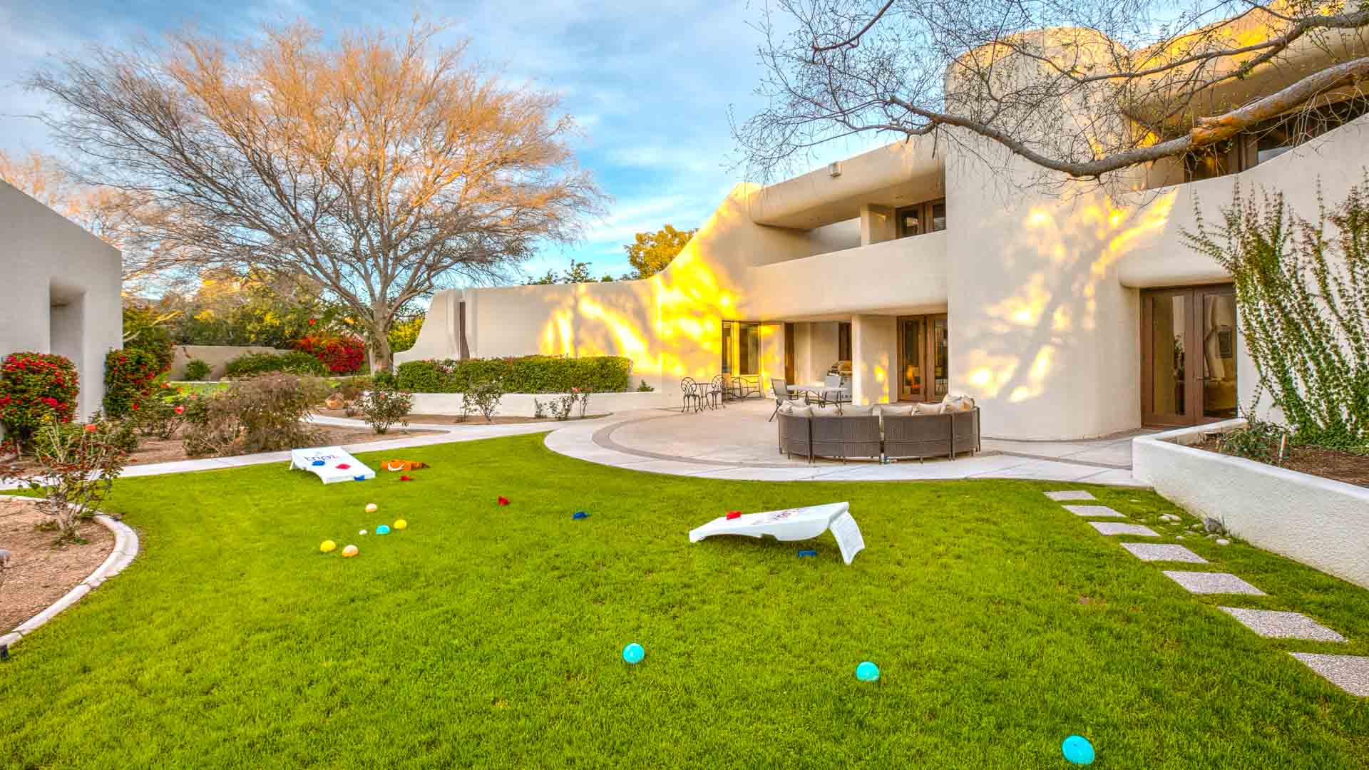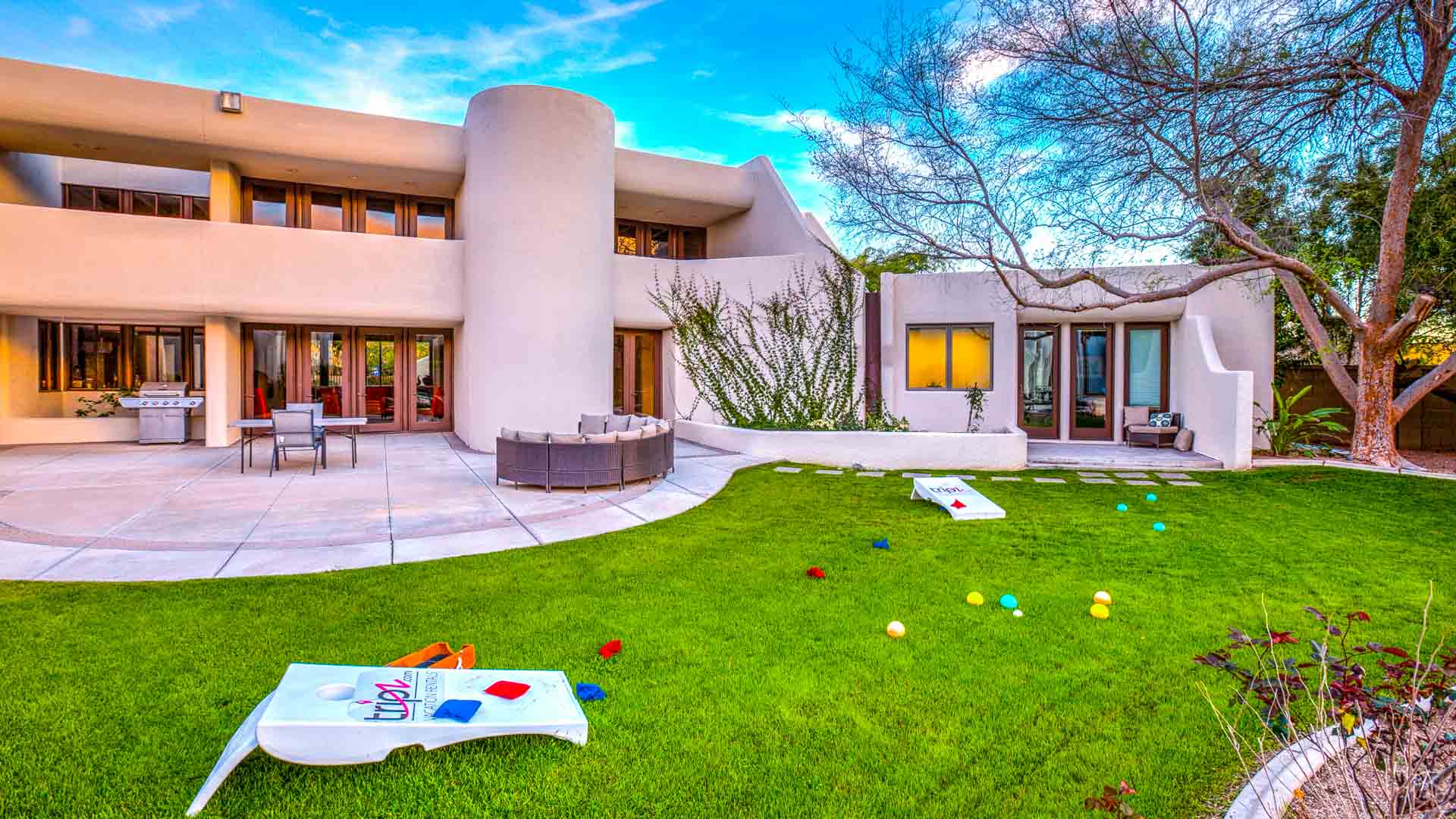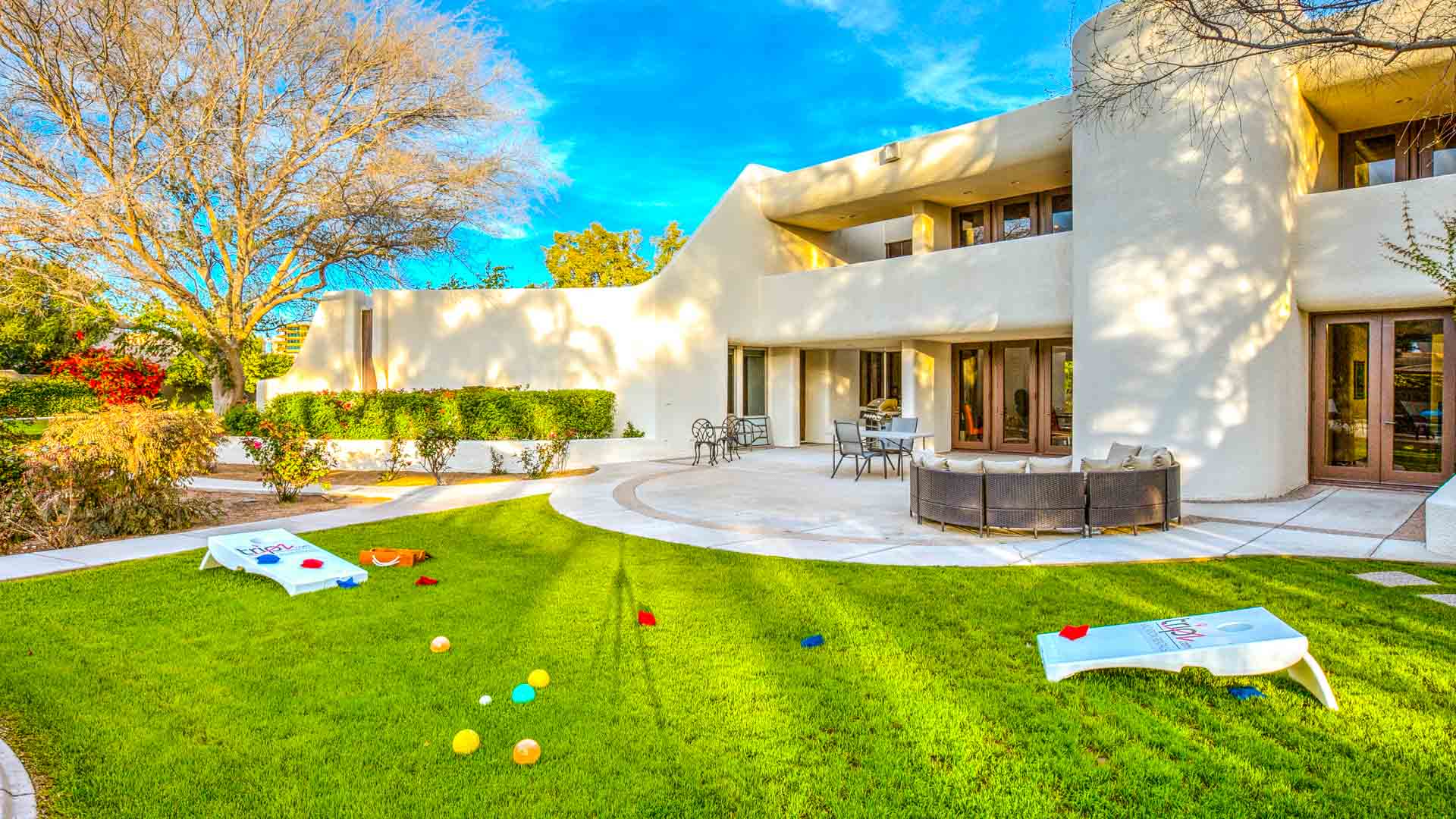 An amazing gated 1.5 acre estate in the heart of Arcadia, inspired by Frank Lloyd Wright. Walking Distance to Old Town! This home boasts over 13,000 sq ft, 8 bedrooms, 10 baths, and a guest house - all with Camelback Mountain views. There is a 9th sleeping area for extra sleeping arrangements. The kitchen is the center point of the home, with the secondary bedrooms split from the master retreat. A fun surprise is the indoor racquetball court, air hockey table & basketball hoop! Solid Brazilian Cherry wood floors. Perfect for your family rental...Large pool, a ''football field'' of grass and a path that goes around the entire property, all this while enjoying your estate surrounded by complete privacy. Welcome to your amazing vacation get-away!