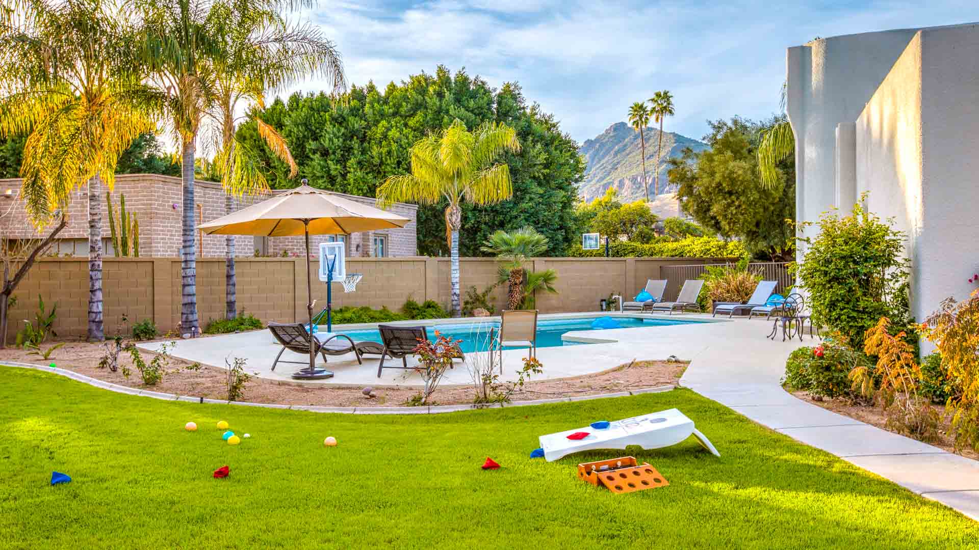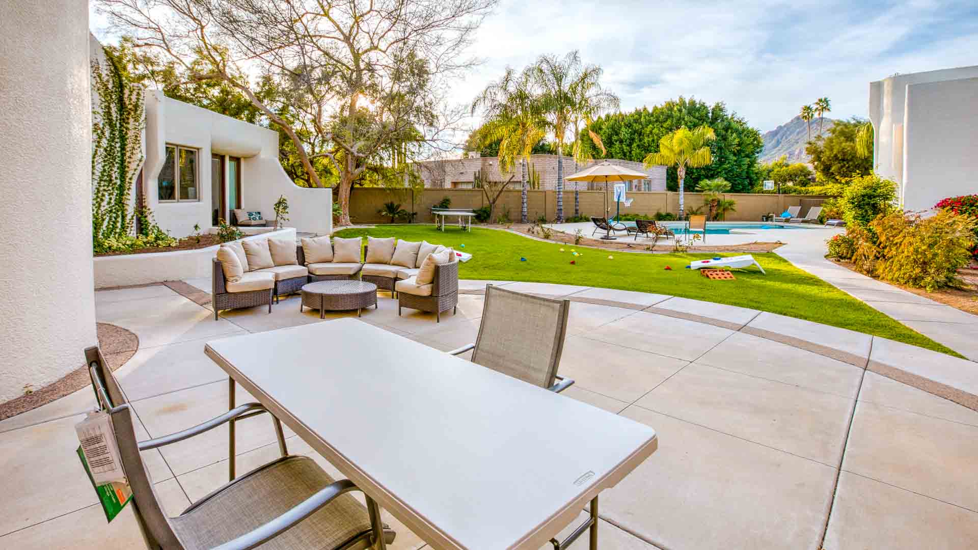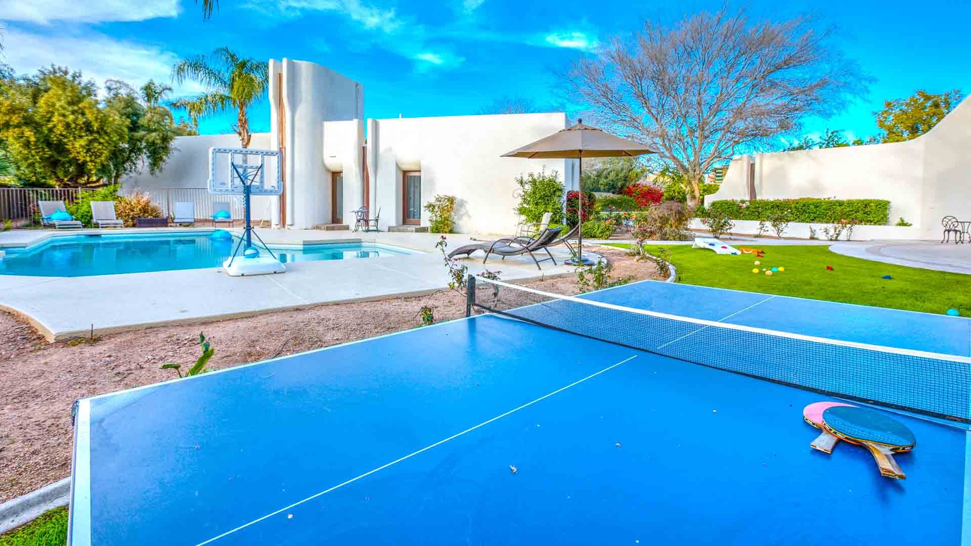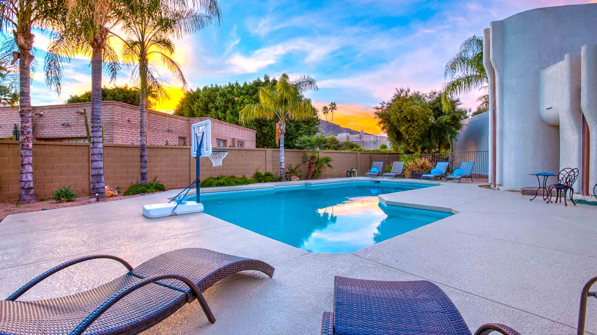An amazing gated 1.5 acre estate in the heart of Arcadia, inspired by Frank Lloyd Wright. Walking Distance to Old Town! This home boasts over 13,000 sq ft, 8 bedrooms, 10 baths, and a guest house - all with Camelback Mountain views. There is a 9th sleeping area for extra sleeping arrangements. The kitchen is the center point of the home, with the secondary bedrooms split from the master retreat. A fun surprise is the indoor racquetball court, air hockey table & basketball hoop! Solid Brazilian Cherry wood floors. Perfect for your family rental...Large pool, a ''football field'' of grass and a path that goes around the entire property, all this while enjoying your estate surrounded by complete privacy. Welcome to your amazing vacation get-away!