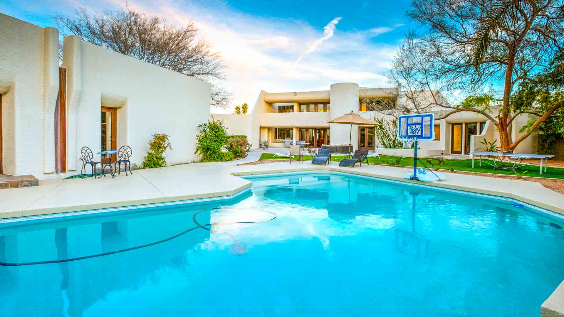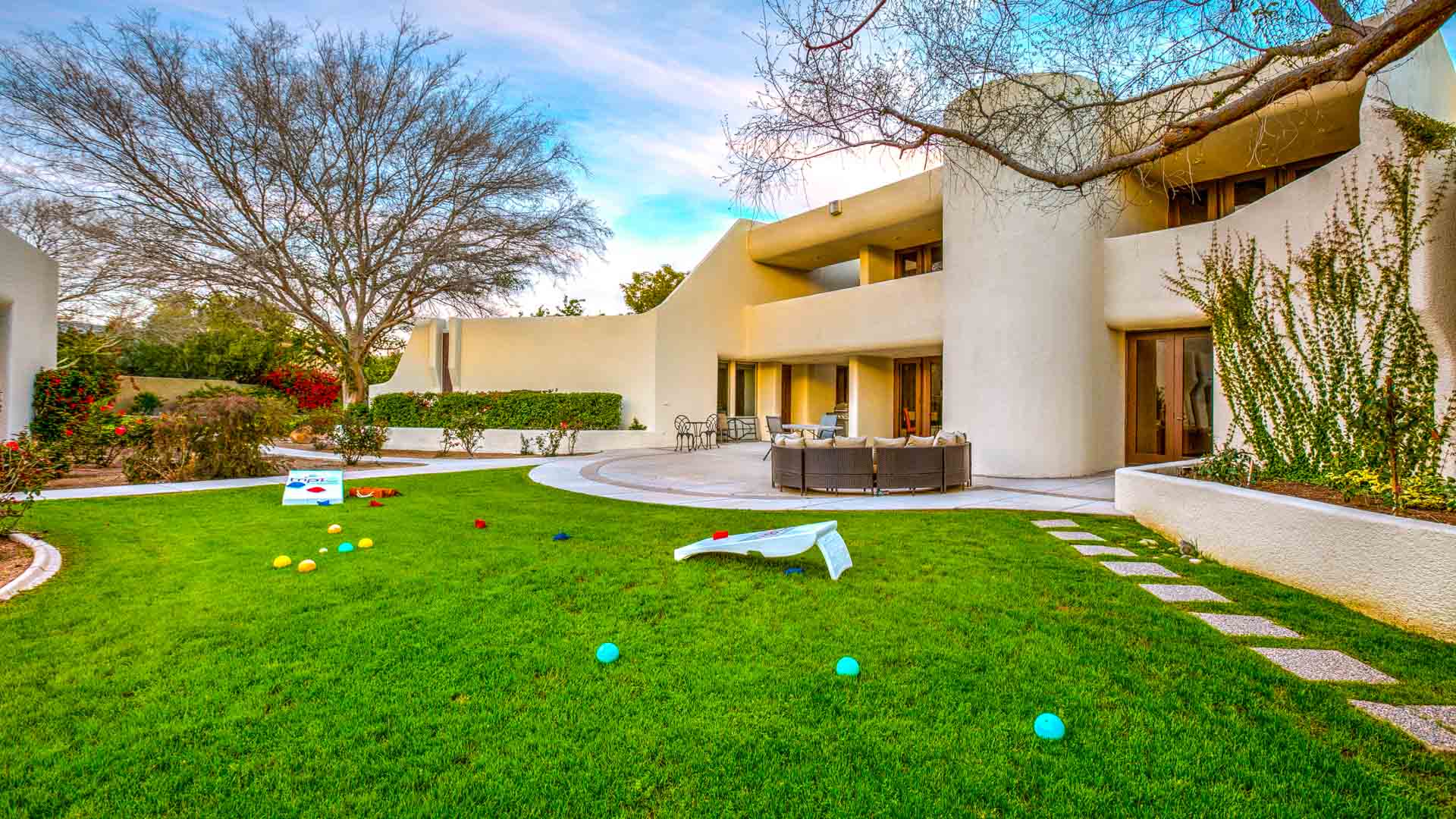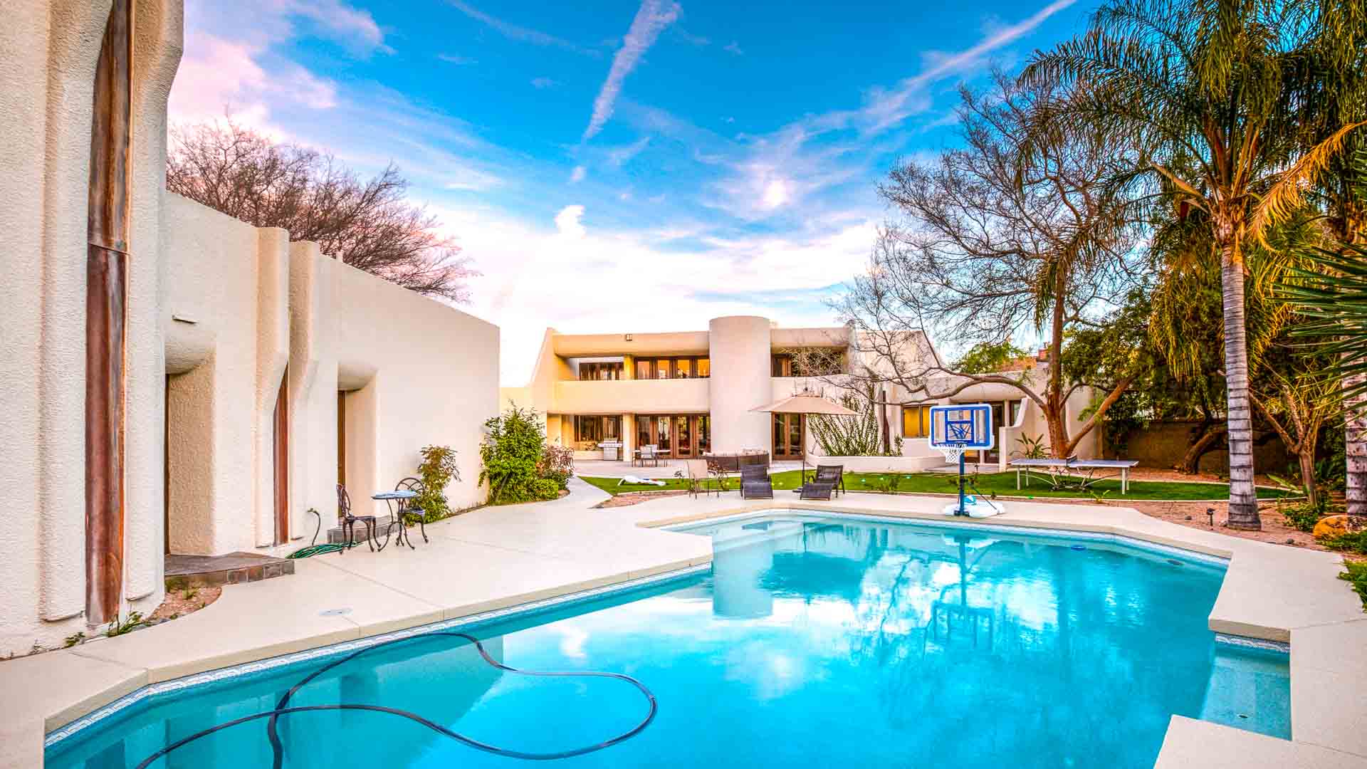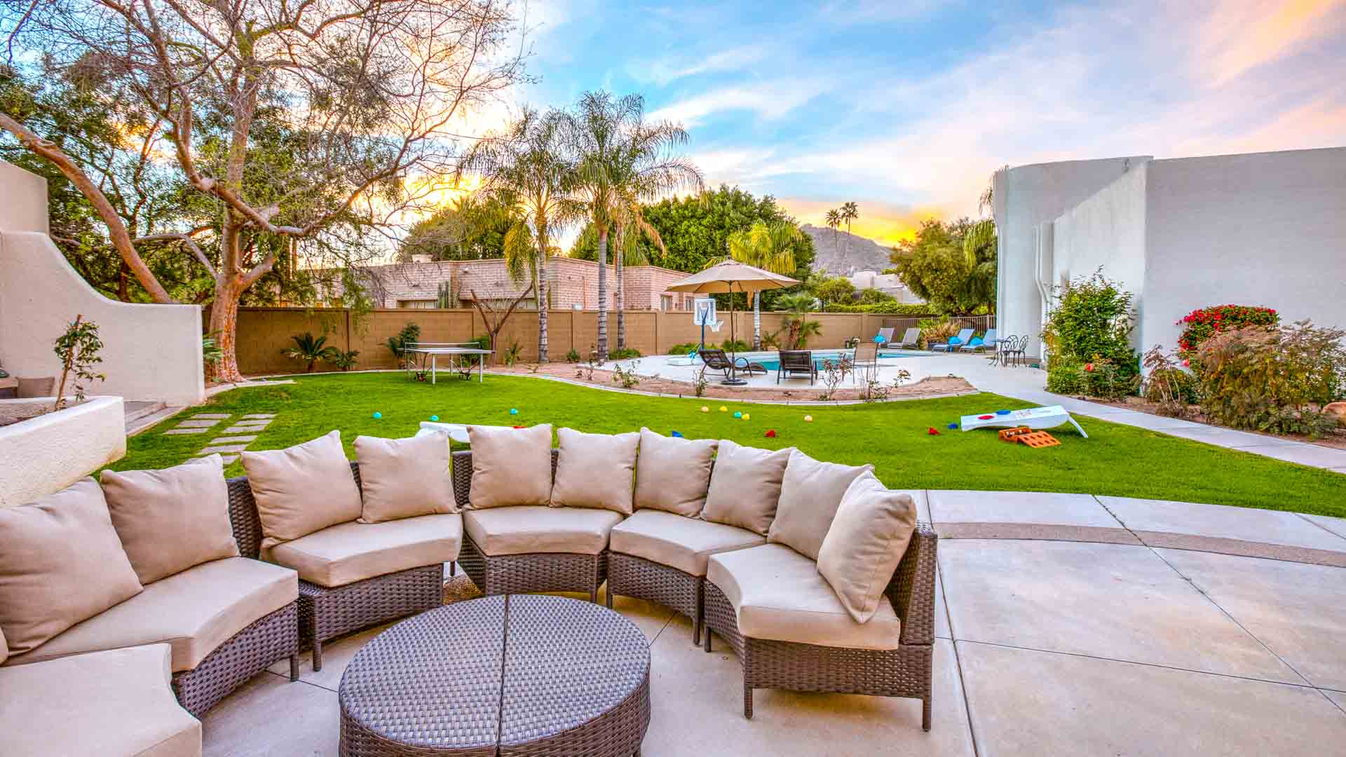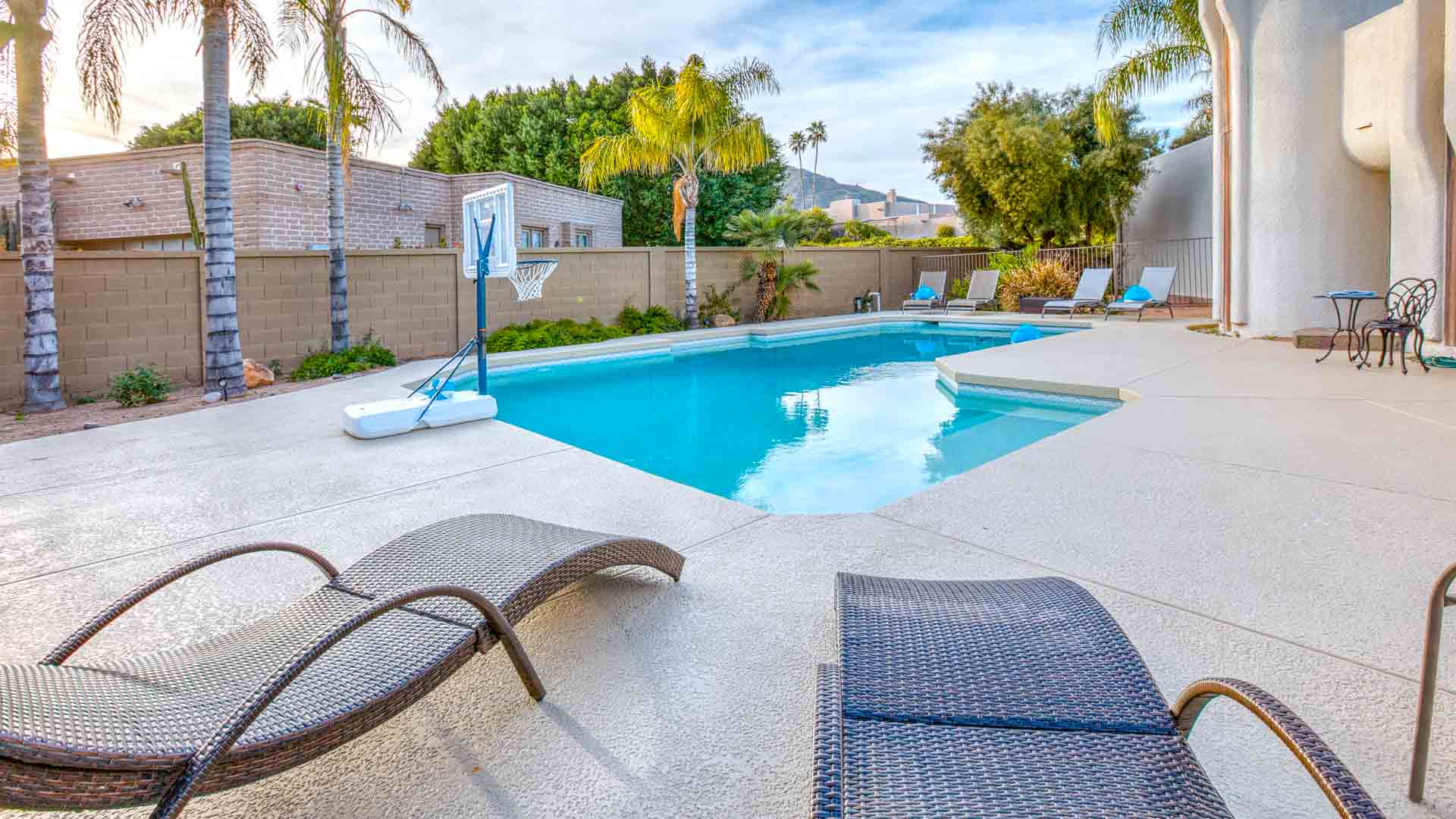 An amazing gated 1.5 acre estate in the heart of Arcadia, inspired by Frank Lloyd Wright. Walking Distance to Old Town! This home boasts over 13,000 sq ft, 8 bedrooms, 10 baths, and a guest house - all with Camelback Mountain views. There is a 9th sleeping area for extra sleeping arrangements. The kitchen is the center point of the home, with the secondary bedrooms split from the master retreat. A fun surprise is the indoor racquetball court, air hockey table & basketball hoop! Solid Brazilian Cherry wood floors. Perfect for your family rental...Large pool, a ''football field'' of grass and a path that goes around the entire property, all this while enjoying your estate surrounded by complete privacy. Welcome to your amazing vacation get-away!