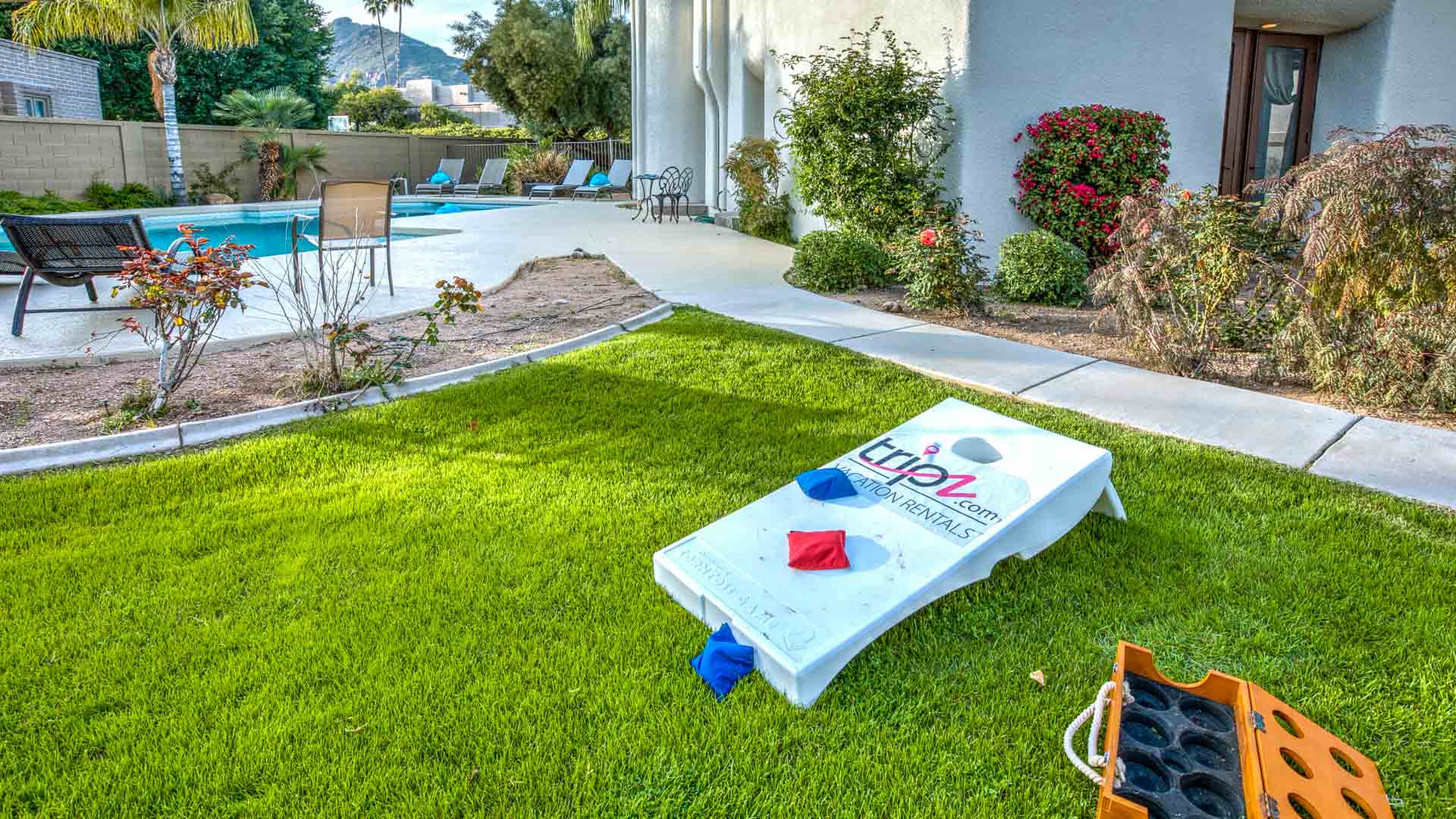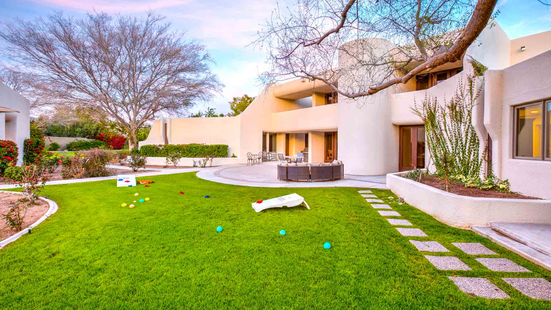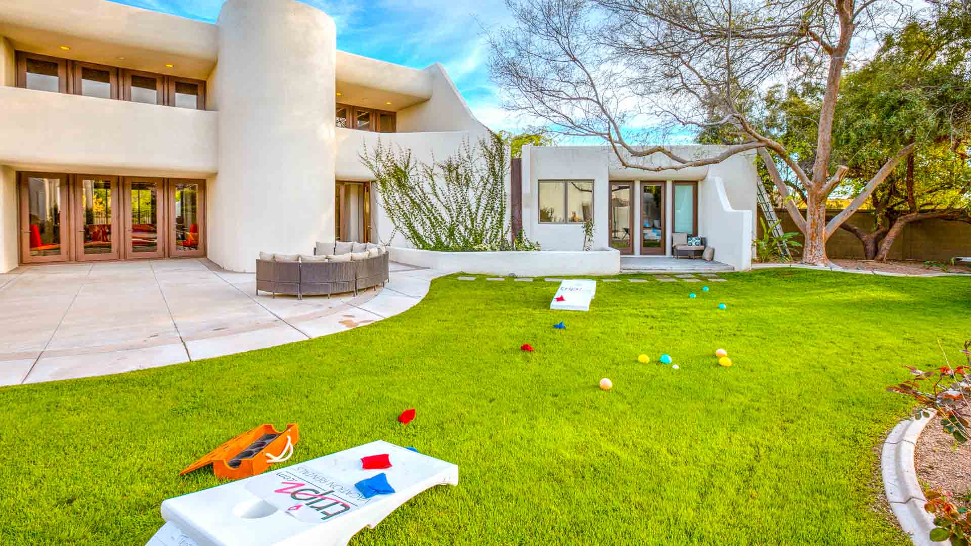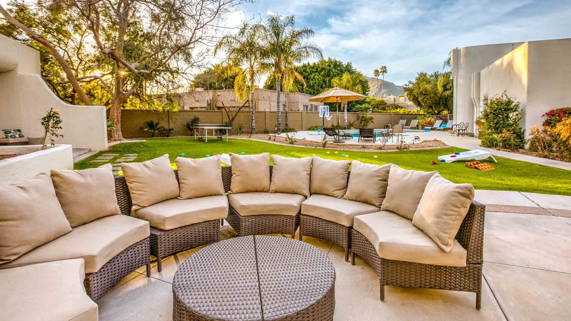 An amazing gated 1.5 acre estate in the heart of Arcadia, inspired by Frank Lloyd Wright. Walking Distance to Old Town! This home boasts over 13,000 sq ft, 8 bedrooms, 10 baths, and a guest house - all with Camelback Mountain views. There is a 9th sleeping area for extra sleeping arrangements. The kitchen is the center point of the home, with the secondary bedrooms split from the master retreat. A fun surprise is the indoor racquetball court, air hockey table & basketball hoop! Solid Brazilian Cherry wood floors. Perfect for your family rental...Large pool, a ''football field'' of grass and a path that goes around the entire property, all this while enjoying your estate surrounded by complete privacy. Welcome to your amazing vacation get-away!